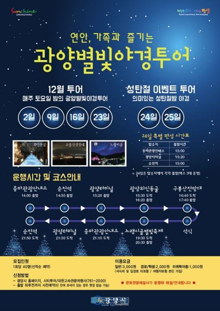 연말과 크리스마스를 맞아 가족과 연인 등 소중한 사람들과의 특별한 추억을 만들기 위해 광양 와인동굴, 구봉산 전망대, 느랭이골 자연리조트를 둘러보는 '광양 별빛 야경투어'에 참여해보자.