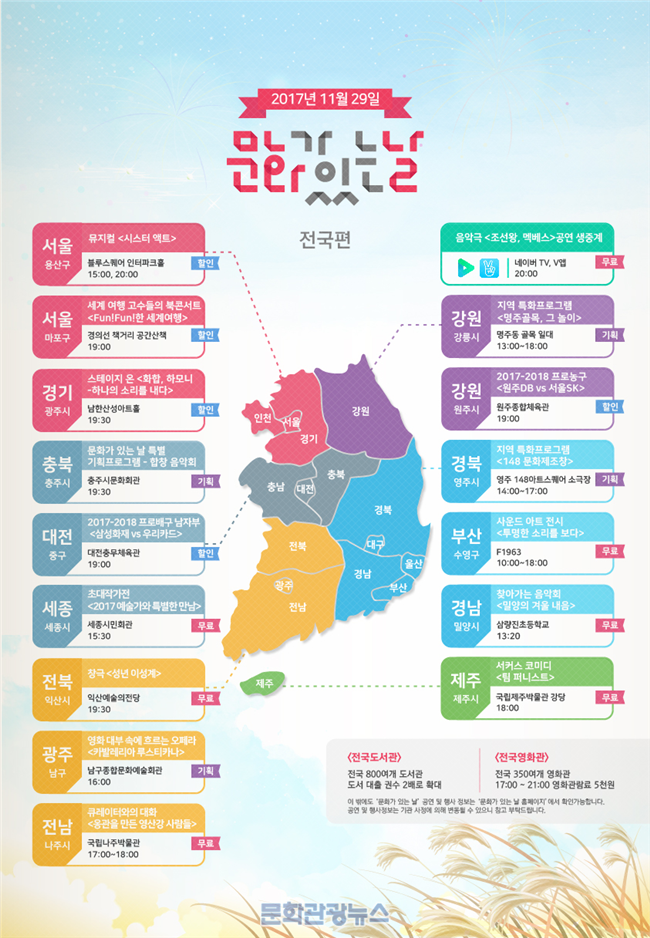 2017년 11월 ‘문화가 있는 날’인 29일과 해당 주간에 총 2,650개(11월 27일 기준)의 문화행사가 전국에서 펼쳐진다. 지역에 활기를 불어넣는 문화 체험부터 공연·행사 등이 풍성하게 준비된다.