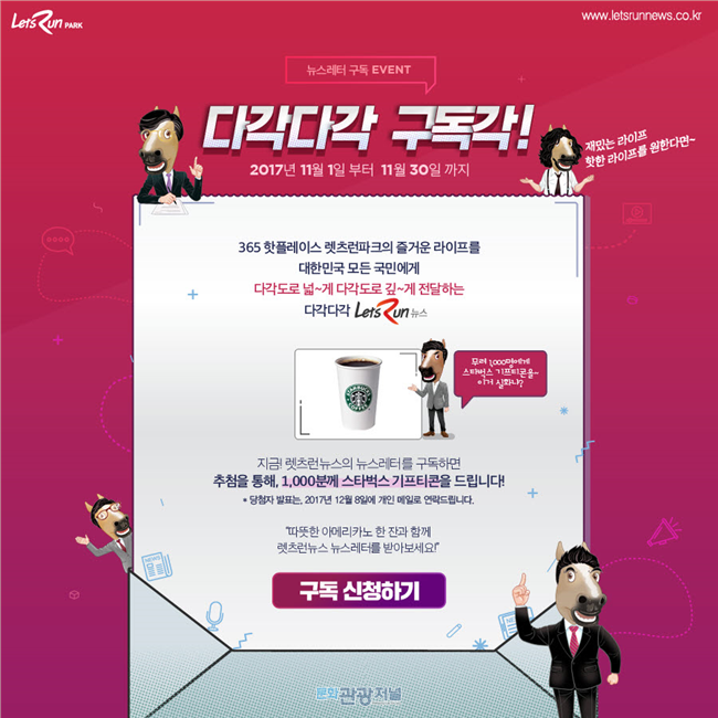 오픈을 맞아 한국마사회는 뉴스레터를 구독하는 사람들을 대상으로 11월 30일까지 약 1달간 스타벅스 기프티콘 증정 이벤트도 진행한다. 추첨을 통해 당첨자를 선정하며 12월 초 개인메일로 당첨여부를 확인 가능하다. 뉴스레터 구독 및 이벤트 참여와 관련한 자세한 내용은 렛츠런뉴스(www.letsrunnews.co.kr)에서 지금 즉시 확인 가능하다.