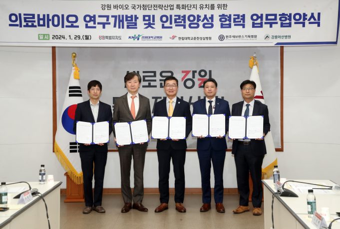 강원특별자치도는 1월 29일(월) 도내 주요병원과 「강원 바이오 특화단지 유치를 위한 의료바이오 연구개발 및 인력양성 협력 업무협약식」을 개최했다고 밝혔다.