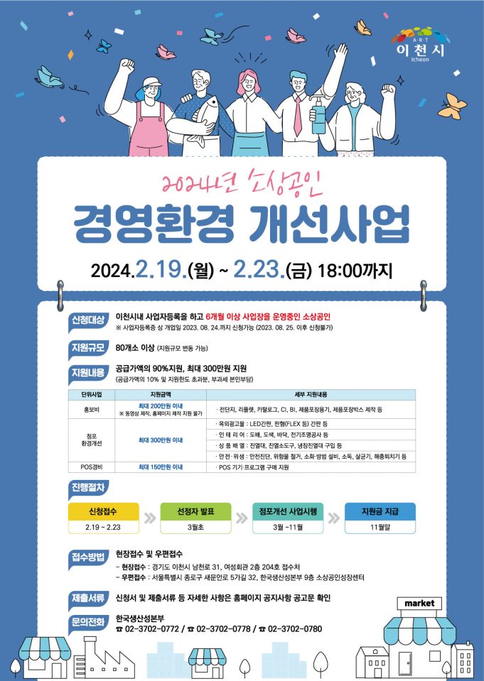 이천시(시장 김경희)는 한국생산성본부와 협약을 체결하여 2024년부터 소상공인 경영환경개선사업을 시작한다.