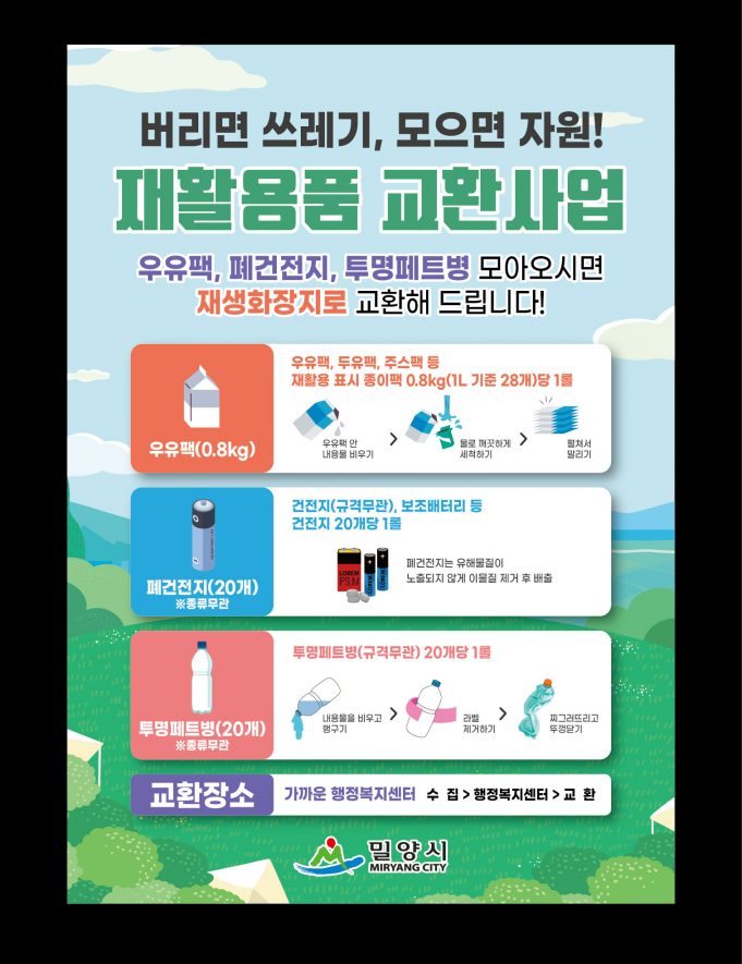 밀양시는 폐자원의 재활용 가치를 시민들에게 공유하고 재활용률을 높이기 위해 기존에 시행하고 있던 교환사업에서 우유팩 교환기준을 변경하고 투명페트병 교환을 추가한다고 22일 밝혔다.