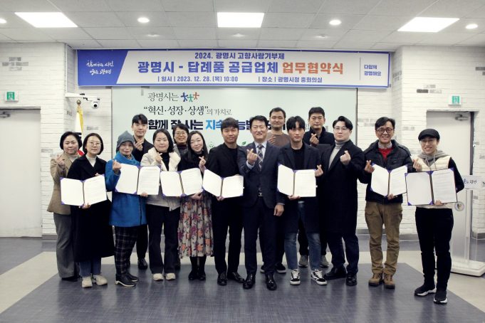 광명시(시장 박승원)는 지난 28일 시청 중회의실에서 고향사랑기부제 답례품 공급업체와 공급 협약을 체결했다.