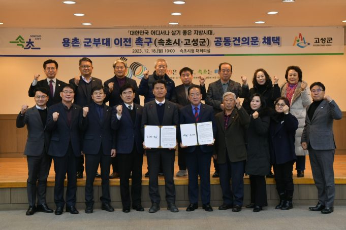 이병선 속초시장과 함명준 고성군수는 18일 속초시청 대회의실에서 고성군 용촌 군부대 이전을 촉구하는 공동 건의문에 서명하고 공동 대응에 나섰다.