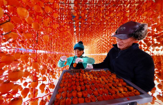 28일 경남 함양군 서하면 황산마을 초원농원 장충명씨 부부가 초매식에 선보일 달콤하고 쫀득하게 잘 익어가는 곶감을 손질히고 있다.