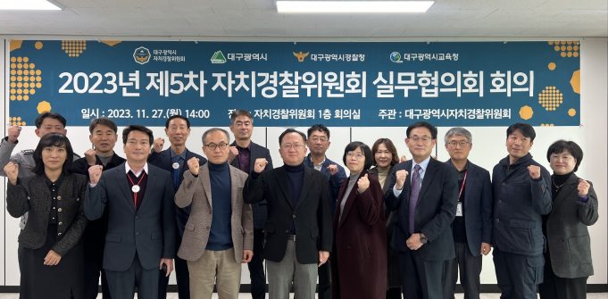 대구광역시 자치경찰위원회는 11월 27일(월) 오후 2시 대구광역시, 대구경찰청, 대구교육청, 대구소방안전본부 관계자 등 15명이 참석한 가운데 ‘2023년 제5차 실무협의회 회의’를 개최했다.