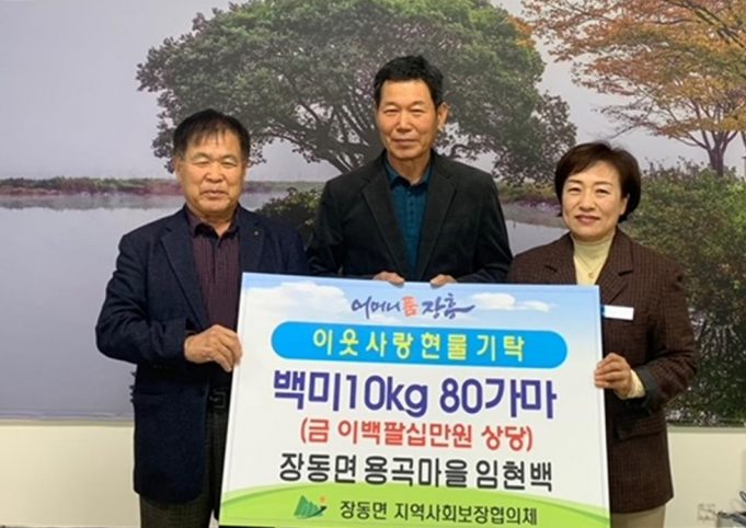 지난 23일 제22대 장동면 번영회장을 지낸 임현백(66세) 씨가 280만 원 상당의 쌀(10kg) 80포대를 장동면지역사회보장협의체에 기부하였다.