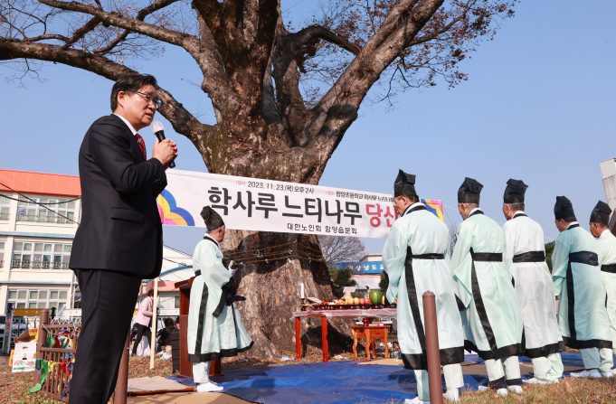 함양군은 11월 23일 함양초등학교 내 수령 500년 이상으로 추정되는 학사루 느티나무에서 군민 안녕과 평안을 기원하는 당산제를 거행했다.