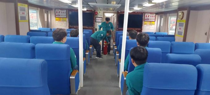 독도평화호(177t) 승무원 안전운항을 위한 안전교육이 16일 독도평화호 선내에서 진행됐다. 이번 교육은 울릉119 안전센터 소속 이성봉(소방교), 김재원(소방사)의 진행으로 선내 화재예방과 진화훈련, 응급환자 발생 시 응급처치 요령 등을 배우는 시간으로 구성되었다.