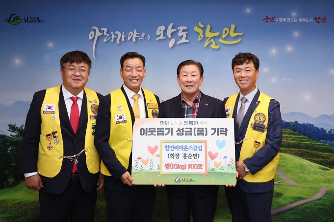 함안라이온스클럽(회장 홍순민)은 9일 함안군청을 방문해 군내 저소득 세대에 전달해달라며 쌀(10kg) 100포와 취임 봉사금 200만 원을 기탁했다.