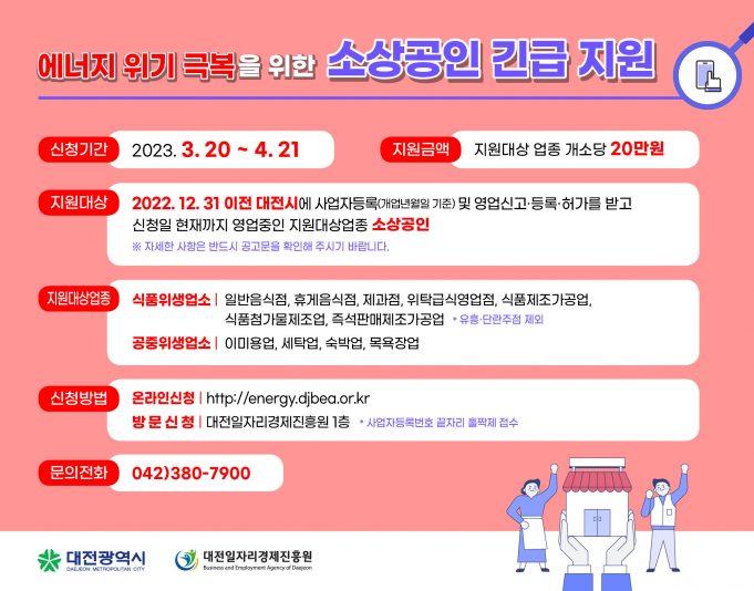 대전시는 전기ㆍ가스 등 공공요금 인상으로 경영에 어려움을 겪고 있는 소상공인의 경제적 부담을 덜어 주기 위해 3만 6천여 식품ㆍ공중위생업소에 개소당 20만 원을 긴급 지원한다고 밝혔다.