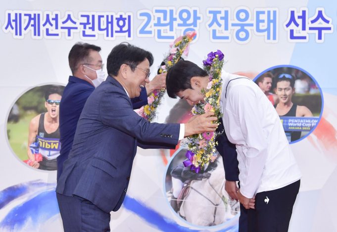 광주광역시는 8일 시청 1층 시민홀에서 2022 근대5종 세계선수권대회 2관왕을 달성한 전웅태 선수의 환영식을 개최했다.