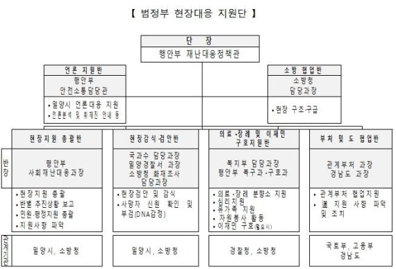 행정안전부는 1월 26일 발생한 밀양시 세종병원 화재사고 수습을 위해 전 행정력을 동원하여 피해수습에 총력을 다하기로 했다. 행정안전부장관이 재난현장에서 직접 사고수습을 지휘하고 있는 가운데 행정안전부, 소방청, 경찰청, 보건복지부, 고용노동부, 국토교통부 6개 부처 30여 명의 범정부 현장대응 지원단을 현지에 파견하게 되었다. 범정부 현장대응...