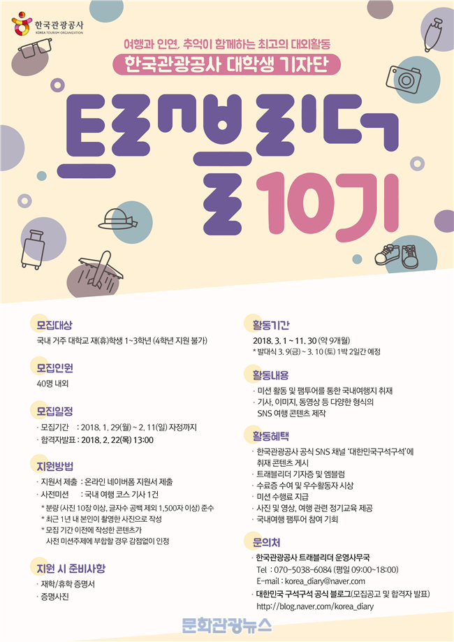 한국관광공사(사장직무대행 강옥희, 이하 공사)는 올 한 해 대한민국 구석구석을 누비며 사회관계망서비스(이하 SNS) 관광홍보 활동을 펼칠 대학생기자단 ‘트래블리더’를 오는 29일부터 다음달 11일까지 모집한다.