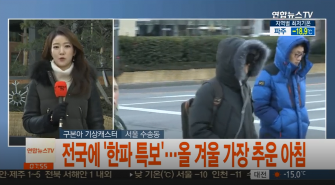 지난 월요일부터 추위가 시작되더니 오늘(24일)부터는 한반도 전체가 꽁꽁 얼어붙었다. 서울은 오늘 오전 체감추위 영하 23도에 달했다.