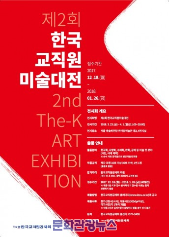 접수기간은 1월 26일까지이며 웹하드(아이디 ktcu0323, 비밀번호 ktcu)에서 참가신청서를 다운받을 수 있다. 출품분야는 한국화, 서양화, 수채화, 판화, 공예 등 미술 전 분야(사진, 서예 제외)에 해당되며, 순수 자유 창작품으로...