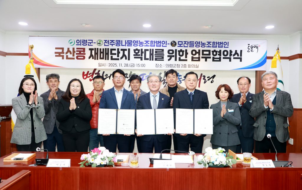 협약식에는 오태완 군수를 비롯해 전주콩나물영농조합법인 양동혁 조합장, 모잔들영농조합법인 이충희 대표 등 관계자 10여 명이 참석했다. 참석자들은 △의령산 나물콩의 안정적 공급 확대 및 출하량 증대 △품질 개선을 위한 기술 지원과 판로 확대 △생산·가공·유통 분야 연계 협력 등을 추진하기로 합의했다.