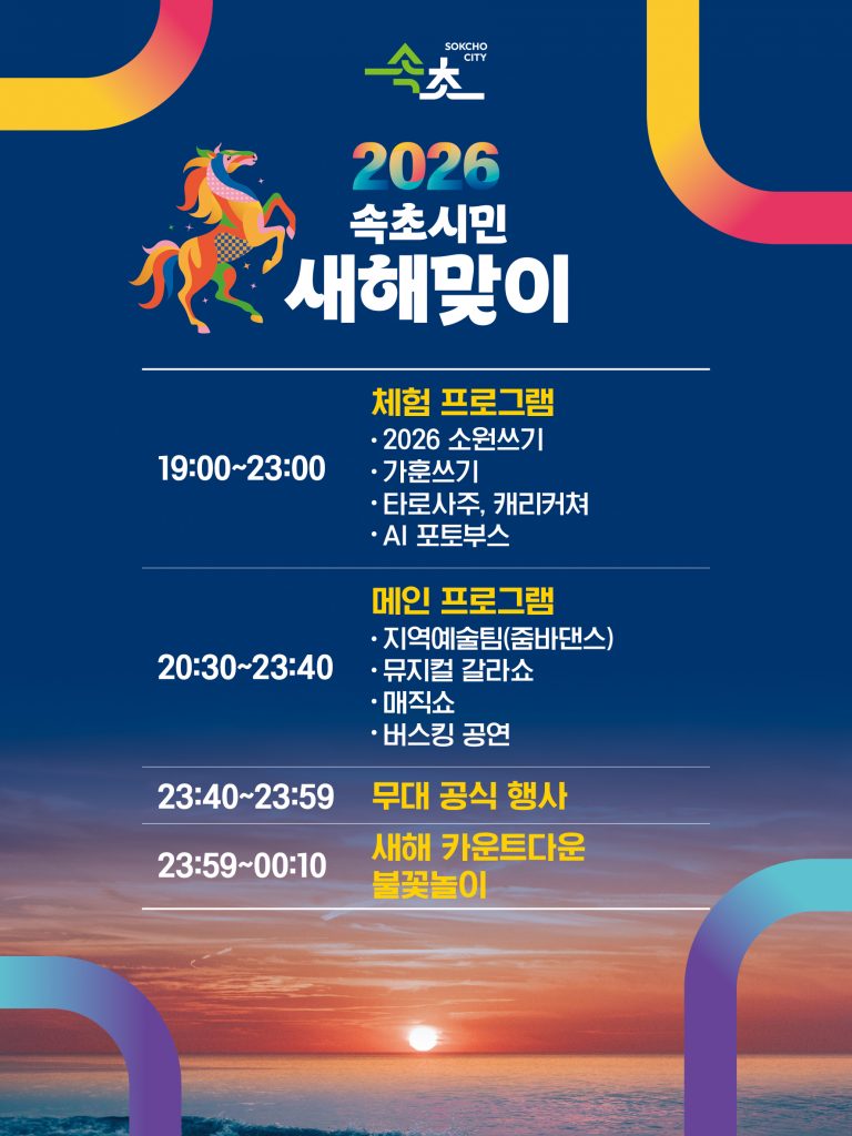 속초시가 병오년 붉은 말의 해를 맞아 오는 12월 31일 오후 7시부터 엑스포 잔디광장 일원에서 ‘2026 속초시민 새해맞이 행사’를 개최한다.