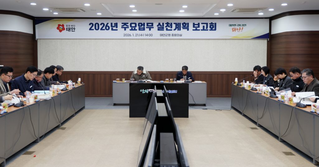 태안군은 지난 21일 군청 중회의실에서 가세로 군수를 비롯해 부군수, 부서장 등이 참석한 가운데 2026년 주요업무 실천계획 보고회를 열고 부서별 추진 전략과 실행 과제를 점검했다.
