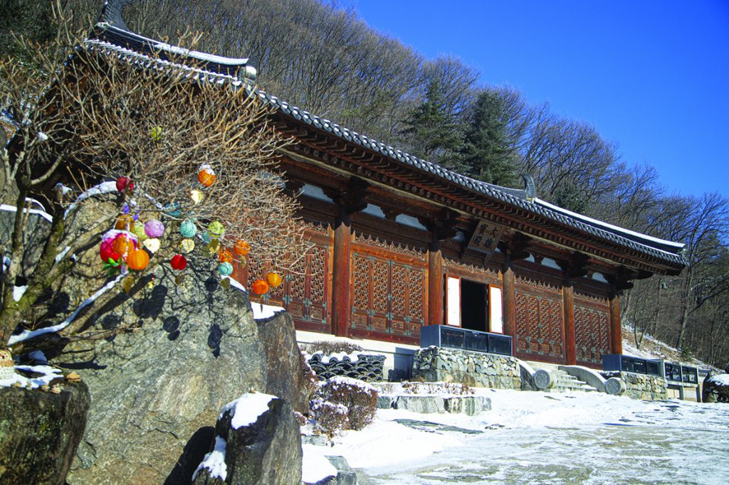 사방이 산으로 둘러싸인 와우정사는 깊은 산중에 자리했음에도 접근성이 뛰어난 사찰이다. 주차장에서 경내까지 바로 이어져 있어 눈이 내린 겨울에도 부담 없이 찾을 수 있다. 설경 속 사찰 산책을 즐기기에 더없이 좋은 조건이다.
