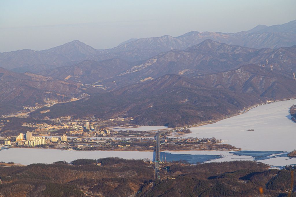 약수터 이후 정상까지는 다소 가파른 구간이 이어진다. 숨이 차오를 즈음 정상에 서면 두 개의 전망대가 기다린다. 한쪽에서는 한강 하류를, 다른 쪽에서는 한강 상류는 물론 남한강과 북한강까지 한눈에 내려다볼 수 있다. 하얀 눈으로 덮인 강과 능선이 어우러진 풍경은 마치 설국에 들어선 듯한 인상을 남긴다.