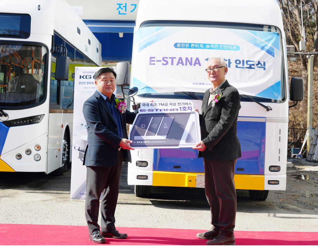 25일 오후 경기 광명시 한 마을버스 차고지. 새하얀 차체에 푸른 전기차 마크를 단 7m급 저상 전기버스가 모습을 드러내자 관계자들의 시선이 한꺼번에 쏠렸다. KGM 커머셜(KGMC)이 국내 최초로 개발한 ‘E-STANA(이-스타나)’ 1호차 인도식이 이곳에서 열렸다.