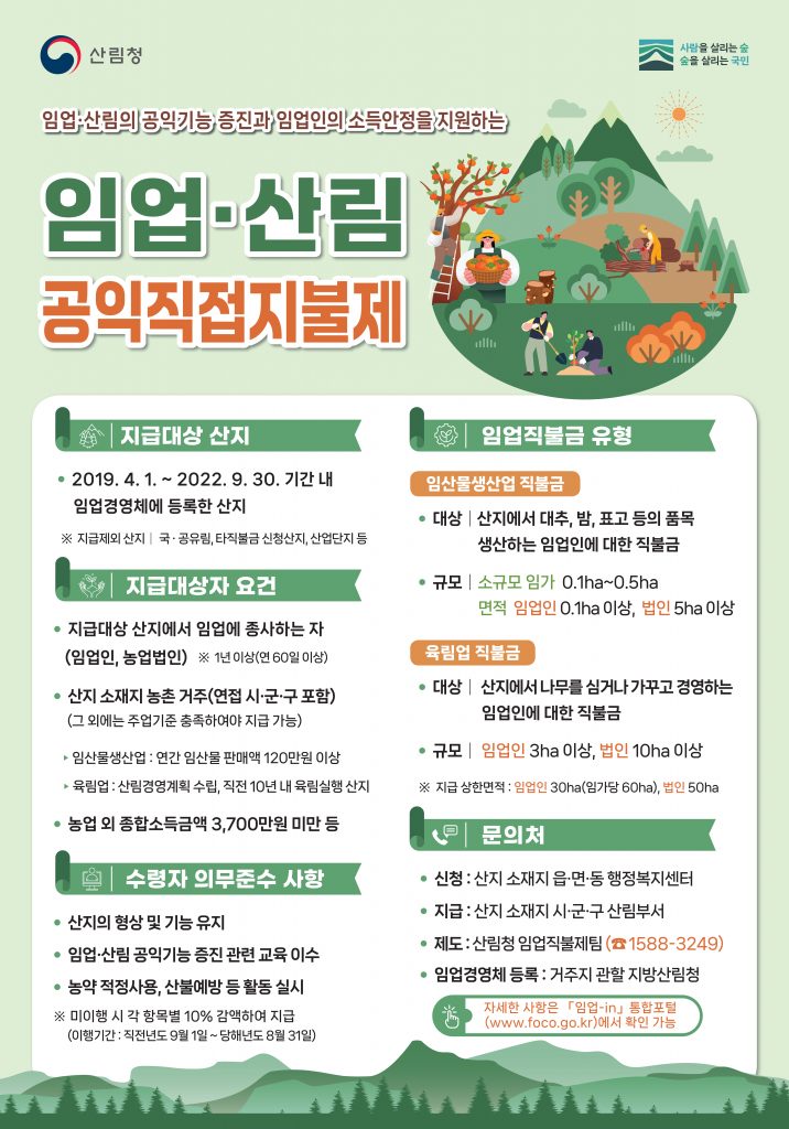 임업직불제는 산림이 지닌 공익적 기능을 높이고 임업인의 소득 기반을 안정시키기 위한 제도다. 지급 대상 산지에서 대추·호두·밤 등 임산물을 생산하거나 나무를 심고 가꾸는 육림업에 종사하는 임업인이 지원 대상이다.