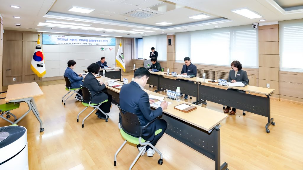 회의실 문이 열리자 간부 공무원들이 차례로 자리를 채웠다. 함안군이 지난 24일 군청 소회의실에서 ‘2026년 제1차 반부패·청렴 추진단 회의’를 열고 청렴도 향상 대책을 본격 논의했다.