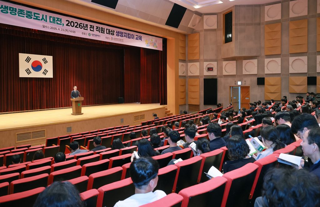 대전광역시는 23일 시청 대강당에서 전 직원을 대상으로 ‘생명지킴이 교육’을 실시했다. 공직자들이 일상 행정 과정에서 위기 신호를 조기에 인지하고 대응할 수 있도록 하기 위한 자리다.