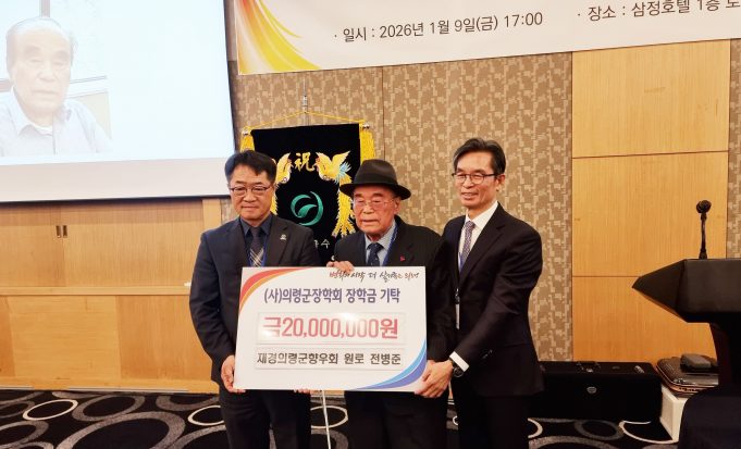 의령군은 지난 9일 서울 강남구 삼정호텔에서 열린 ‘2026년 재경의령군향우회 신년하례회’에서 전병준 씨가 사단법인 의령군장학회에 장학금을 전달했다고 밝혔다.