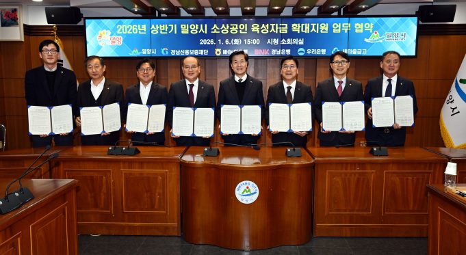 밀양시는 6일 경남신용보증재단과 NH농협은행, BNK경남은행, 우리은행, 새마을금고와 함께 ‘2026년 상반기 소상공인 육성자금 확대 지원’을 위한 업무협약을 체결했다고 밝혔다.
