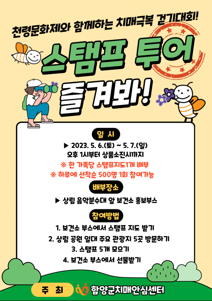 이번 함양군 치매극복걷기행사는‘즐겨봐!, 스탬프투어’라는 주제로 실시되며, 지역주민들과 행사방문객들이 지역축제와 걷기행사 모두를 즐길 수 있도록 천령문화제 기간(5.5~5.9)에 준비하게 되었다.