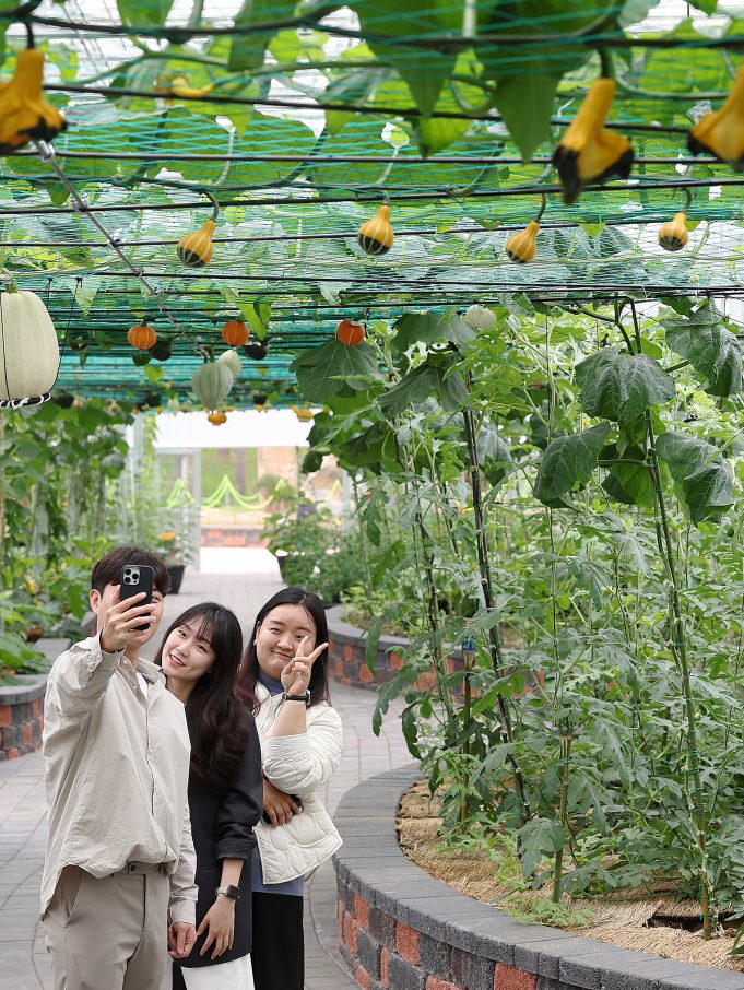 20일 함평엑스포공원 친환경농업관을 찾은 관광객들이 호박이 주렁주렁 매달린 터널을 배경으로 사진을 찍고 있다.