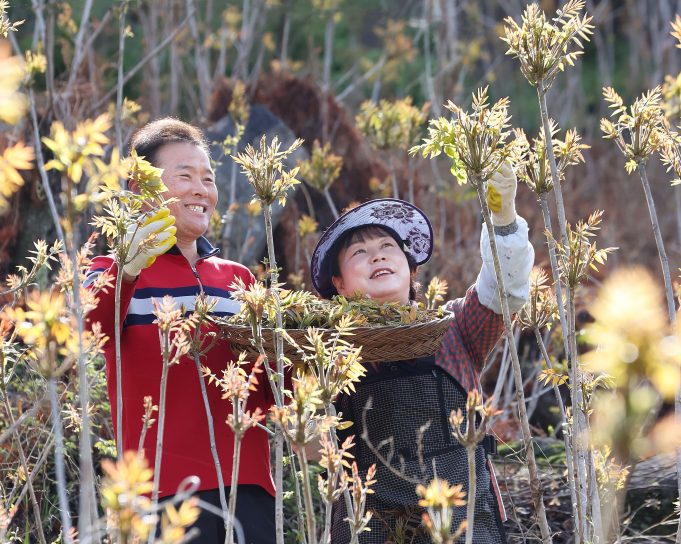 17일 지리산 자락인 경남 함양군 마천면 의탄리 의중마을에서 장철안씨 부부가 봄나물의 으뜸인 옻순을 따고 있다.