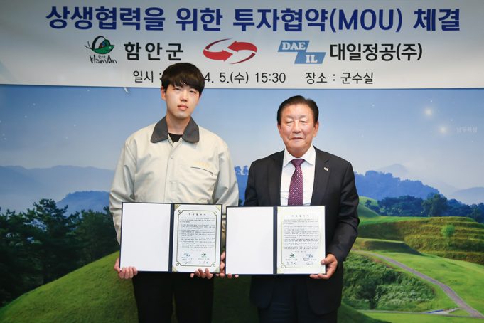 함안군은 지난 5일 오후 3시 30분 군수실에서 대일정공(주)와 115억 원, 신규고용 50명 규모의 투자협약(MOU)을 체결했다.