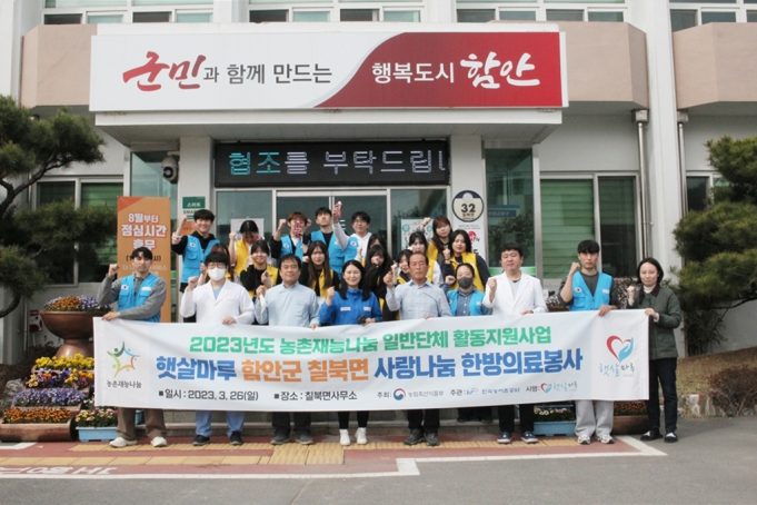 사단법인 햇살마루(이사장 엄경희)는 지난 25일부터 26일까지 1박 2일 일정으로 한의사 3명(단장 안수봉), 재능나눔봉사자 23명으로 구성된 의료팀을 구성해 함안 칠북면 주민을 대상으로 칠북면사무소에서 한방 의료봉사를 진행했다.