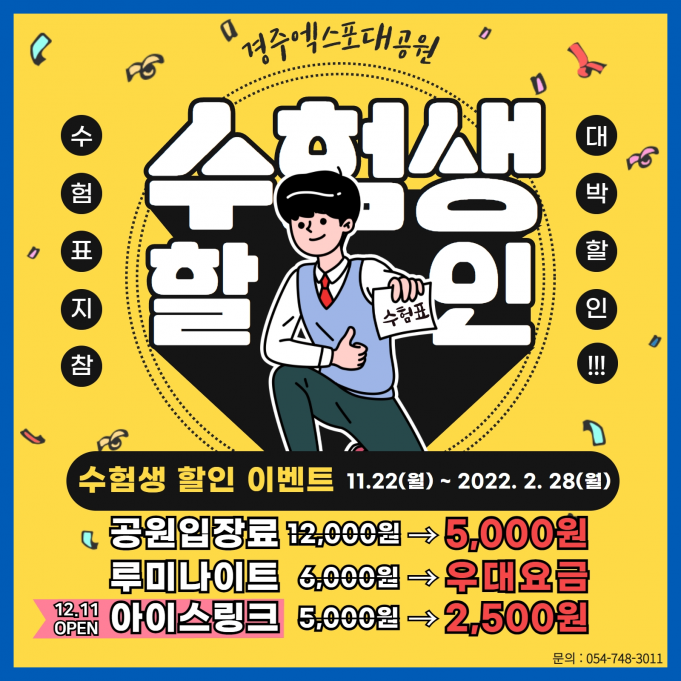 경주엑스포대공원은 22일부터 오는 2월 28일까지 ‘2022학년도 대학수학능력시험’을 치른 수험생들에게 할인 프로모션을 진행한다고 23일 밝혔다.