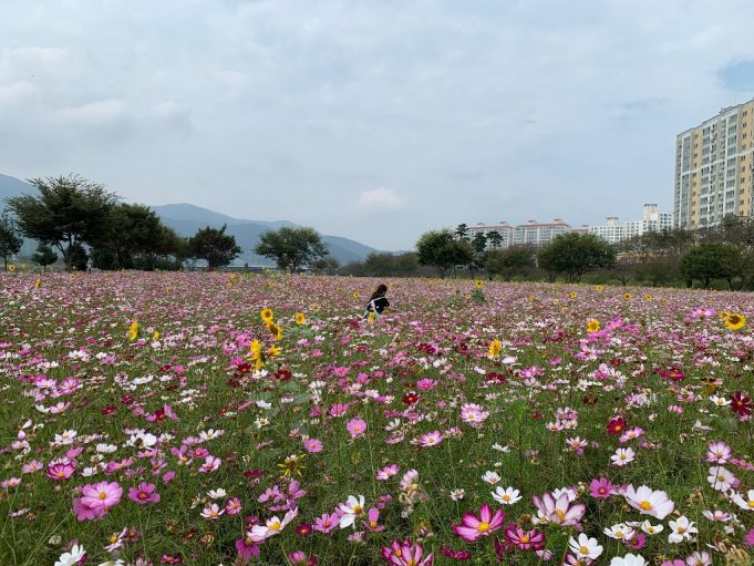 밀양시 삼문동 소재의 밀양강 둔치에 코스모스, 분홍 가우라, 구절초 등이만개해 가을꽃의 향연이 시작됐다.