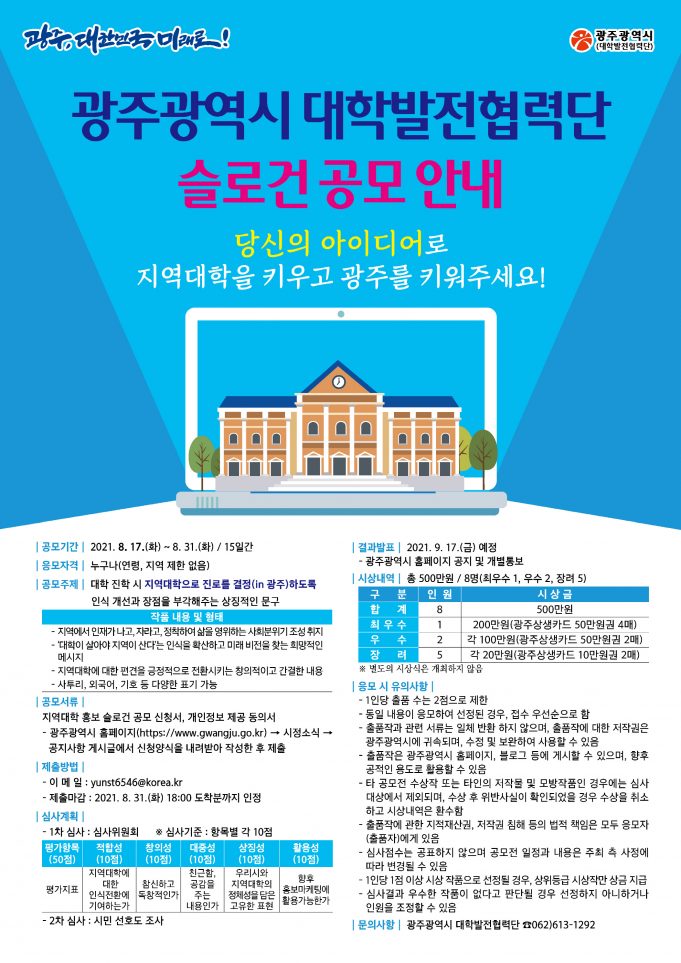 광주광역시는 지역대학 홍보마케팅의 일환으로 ‘지역대학 홍보 슬로건 공모전’을 개최한다.