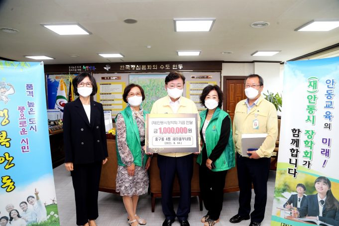 지역우수인재를 육성하기 위해 설립 운영되고 있는 (재)안동시장학회(공동이사장: 권영세 ․ 김원)에 안동시 중구동 4통 새마을부녀회(회장 유정희)에서 8월 10일 백만 원의 장학금을 전달했다.