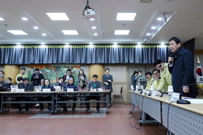 진영 장관이 11일 오후 우한시 귀국 국민 임시생활시설 현장을 점검한 뒤 운영 관리 등을 논의하기 위해 경기도 이천시 장호원읍사무소에서 지역주민들과의 간담회를 하고 있다.