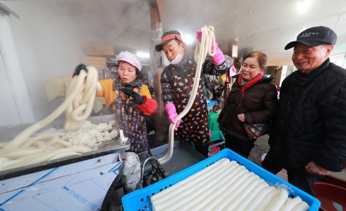 설 연휴를 나흘 앞둔 21일 오전 경남 함양군 함양읍 남양 떡집에서 상인들이 분주하게 가래떡을 뽑고 있다.