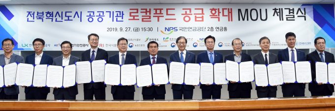 전주시는 27일 국민연금공단 본사에서 농림축산식품부, 전라북도, 완주군, 전북혁신도시 12개 ‘로컬푸드 소비확대를 통한 지역생산-지역소비의 먹거리 선순환체계 구축과 상생·균형발전을 위한 업무협약’을 체결했다. 이날 협약식에는 김승수 전주시장과 이재욱 농림축산식품부 차관, 최용범 전라북도 행정부지사, 박성일...