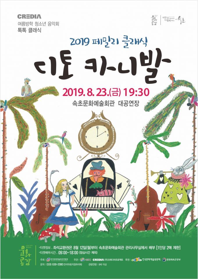 속초시 (시장 김철수)는 8월 23일 속초문화예술회관 대공연장에서 ‘2019년 문예회관과 함께하는 방방곡곡 문화공감사업’에 공모 선정된 페밀리 클래식『디토카니발』공연을 시민에게 무료로 선보인다.
