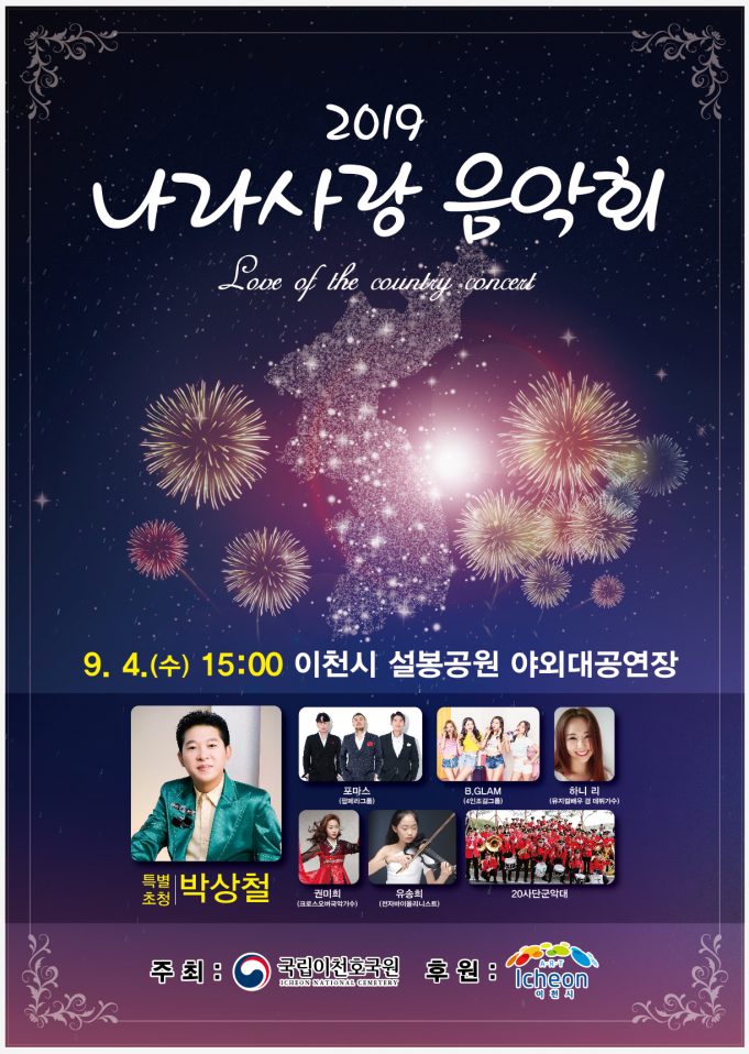 국립이천호국원(원장 김영진)은 오는 9월 4일 오후 3시, 이천시 설봉공원 야외대공연장에서 이천시민과 함께하는 ‘2019 나라사랑 음악회’를 개최한다.