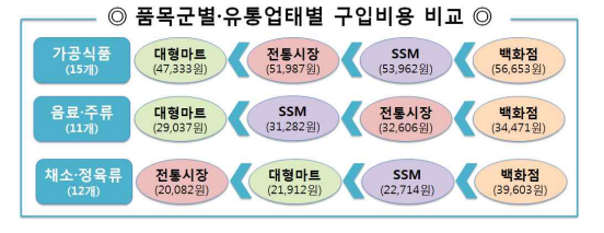 한국소비자원(원장 이희숙)이 금년 7월 5일을 기준으로 휴가철 캠핑용 식재료로 많이 소비되는 가공식품류 등 25개 품목 39개 상품의 가격을 조사한 결과 가공식품은 대형마트, 채소·정육류는 전통시장이 저렴한 것으로 나타났다.