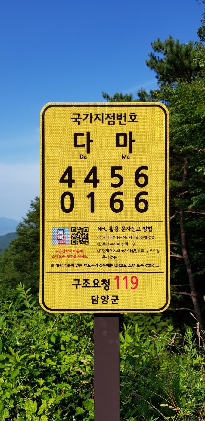24일 담양군에 따르면 관내 등산로인 금성산성외 6곳 77개소에 스마트폰 NFC(근거리무선통신) 기능 활용으로 조난신고 위치를 지점번호와 GPS(위성항법)까지 문자 전송이 가능한 국가지점번호판을 설치했다.