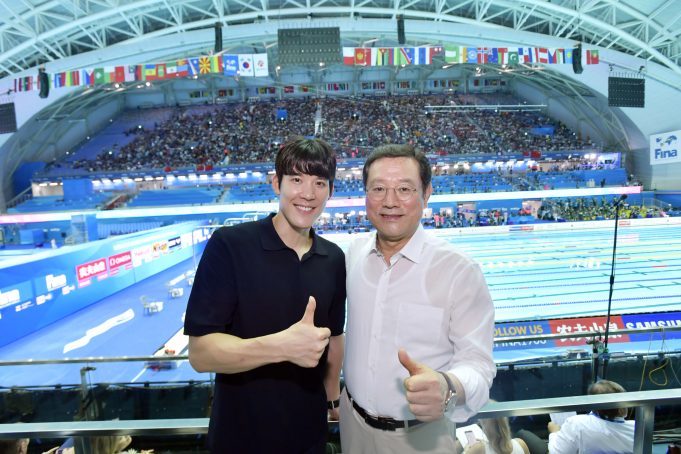 이용섭 2019광주세계수영선수권대회 조직위원장 겸 광주광역시장이 지난 21일 오후 광산구 남부대 시립국제수영장에서 박태환 수영대회 홍보대사와 경영 경기 관람을 했다.