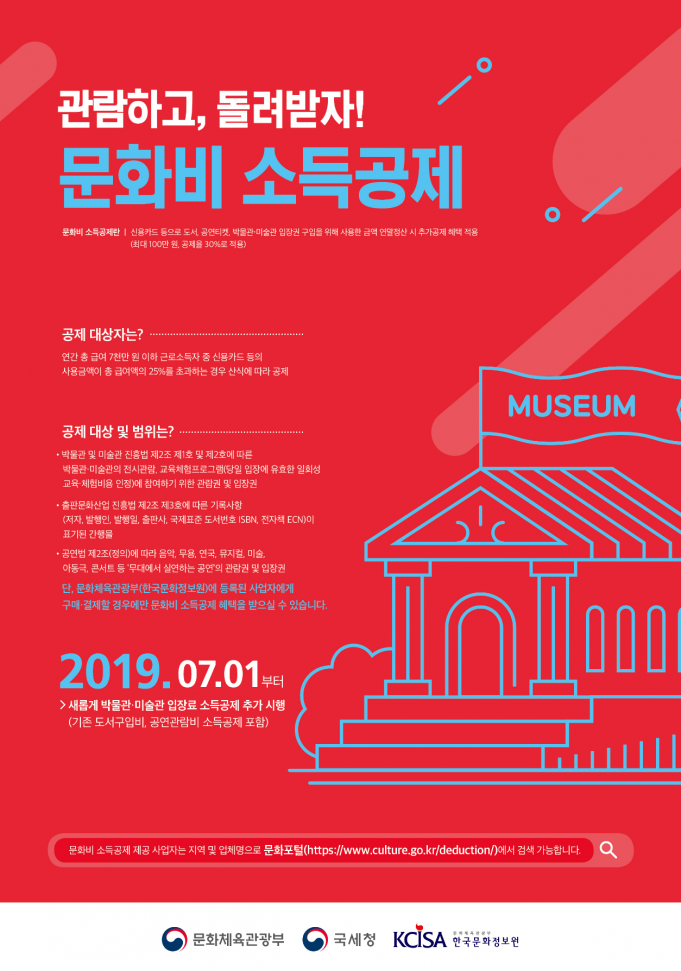 문화체육관광부는 7월 1일(월)부터 박물관·미술관에 입장하기 위해 신용카드 등으로 사용한 금액(이하 박물관·미술관 입장료)에 대한 소득공제가 시행된다고 발표했다.