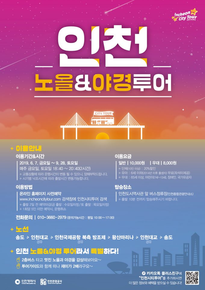 인천광역시(시장 박남춘)와 인천관광공사(사장 민민홍)는 인천을 찾는 관광객과 인천 시민을 대상으로 색다른 즐거움을 선사하기 위해 2층버스를 타고 가이드의 해설과 함께하는 ‘인천 노을&야경투어(이하 ’야경투어‘)를 신규 운영한다고 지난 3일 밝혔다.